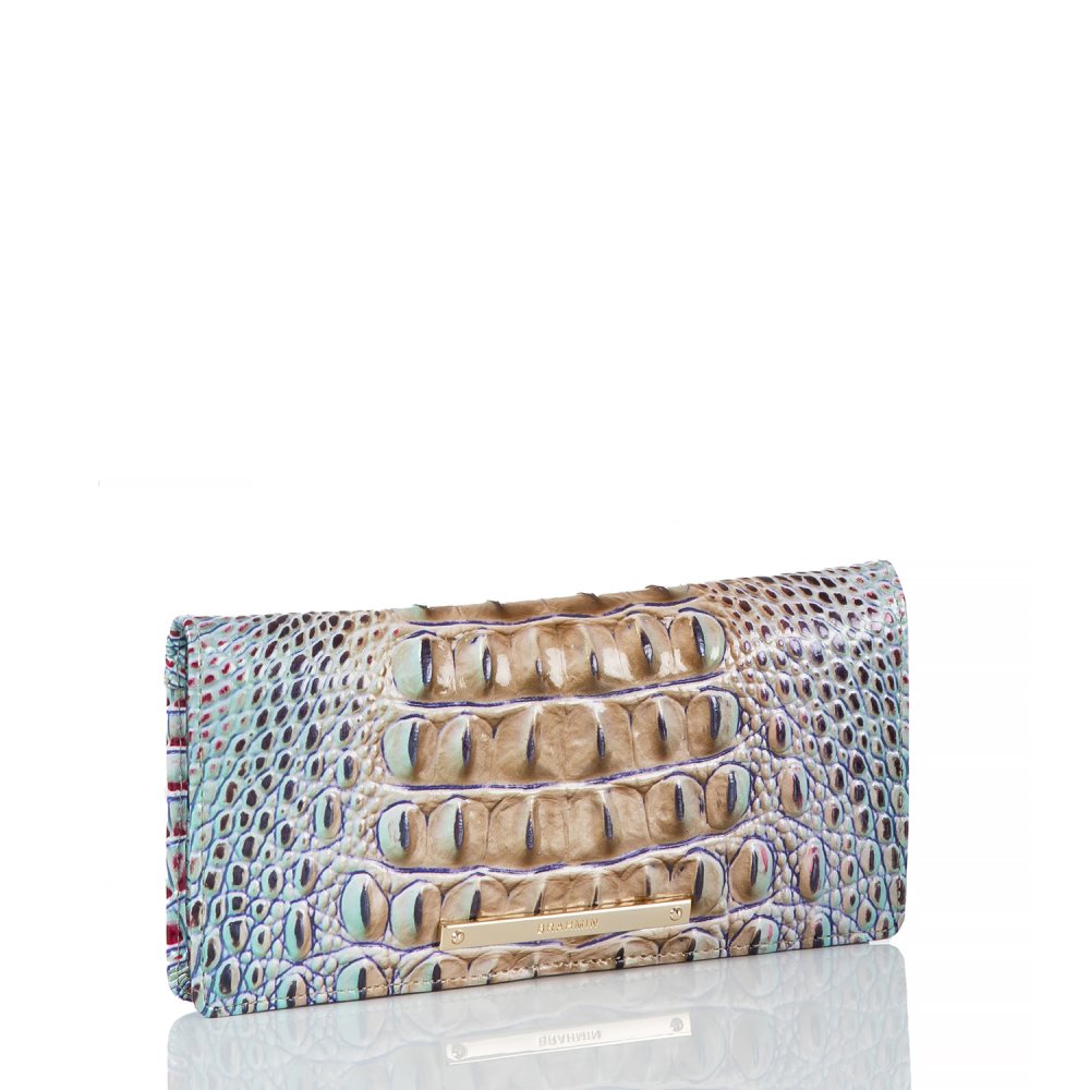 Featured in Seltzer Ombre Melbourne, lively blend of neutral hues with yellow tones and a colorful metallic blue shade with touches of berry tipping. Genuine croc-embossed leather.