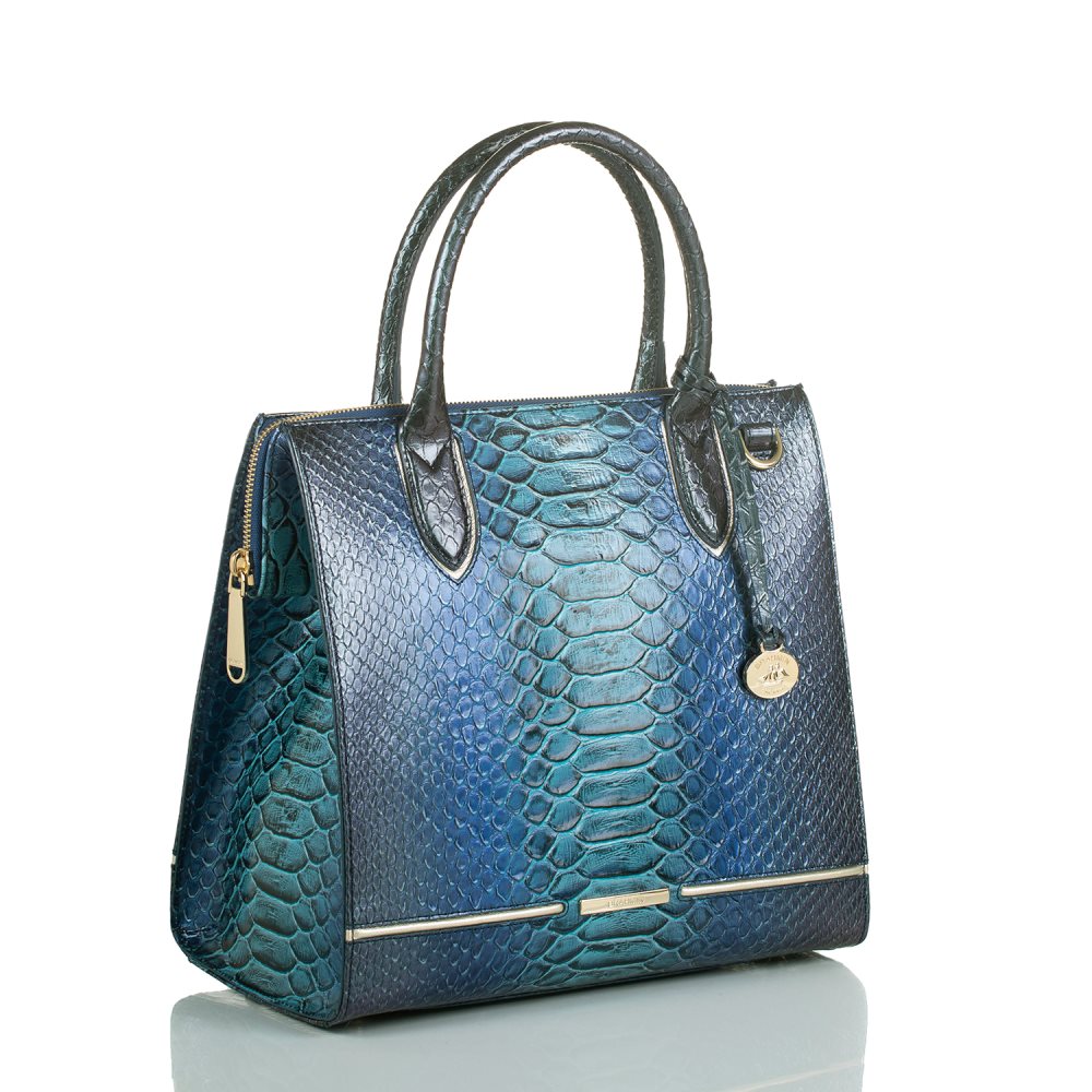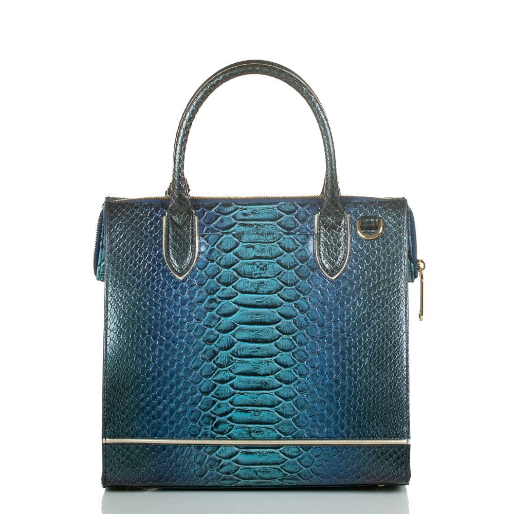 Featured in Sapphire Ateague, an all-over embossed snake texture in a refreshing blend of blue hues trimmed with smooth metallic platinum leather. Genuine leather.