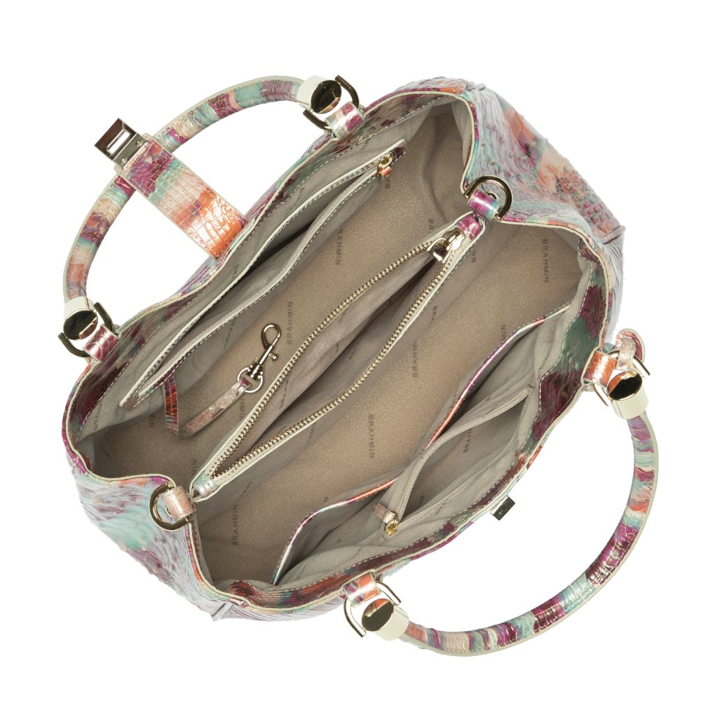 Featured in Destiny Melbourne, an elegant abstract print blending pink, blue, and orange tones. Genuine croc-embossed leather.