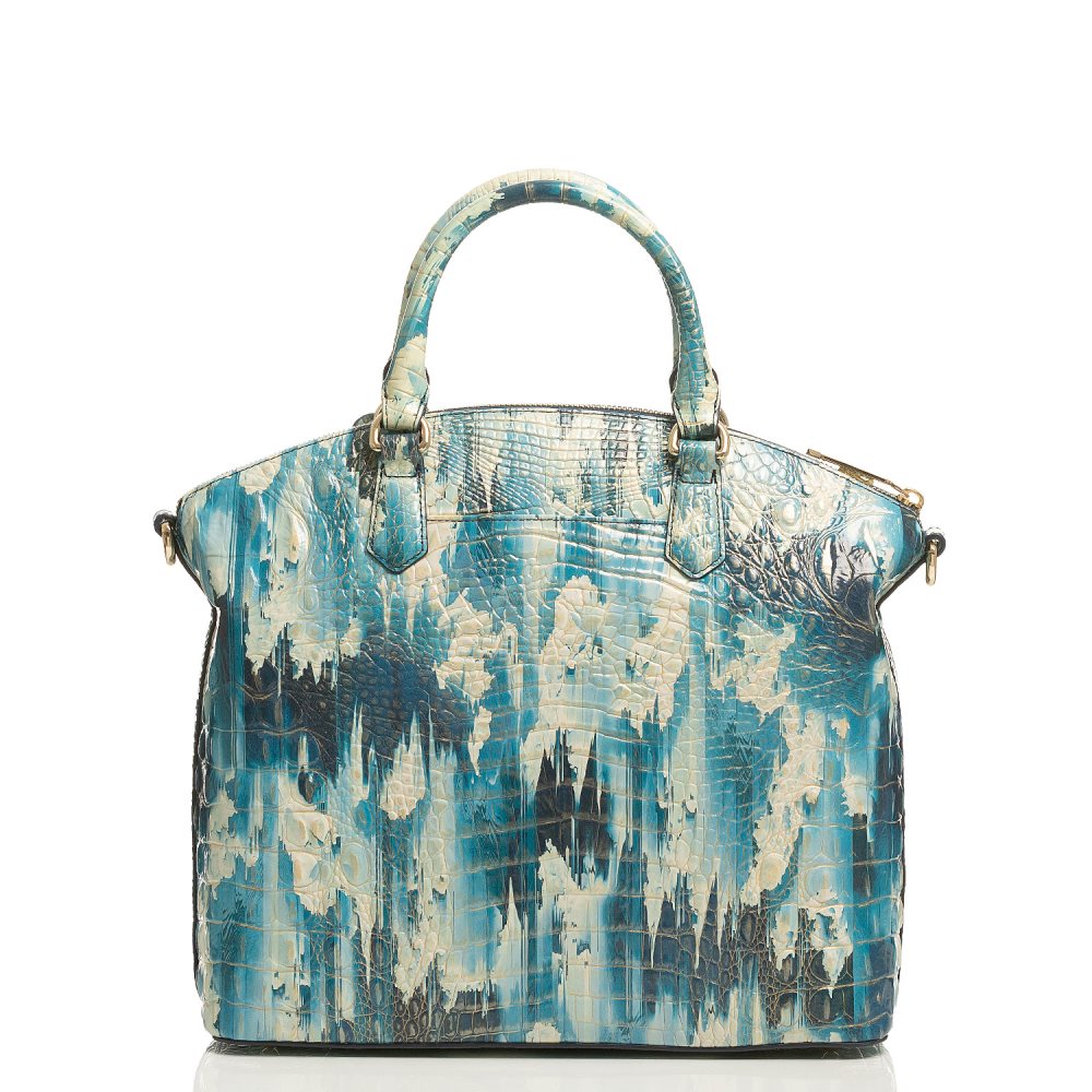 Featured in Deep Water Melbourne, an artistic graphic print with strokes of blue, cream, and navy. Genuine croc-embossed leather.