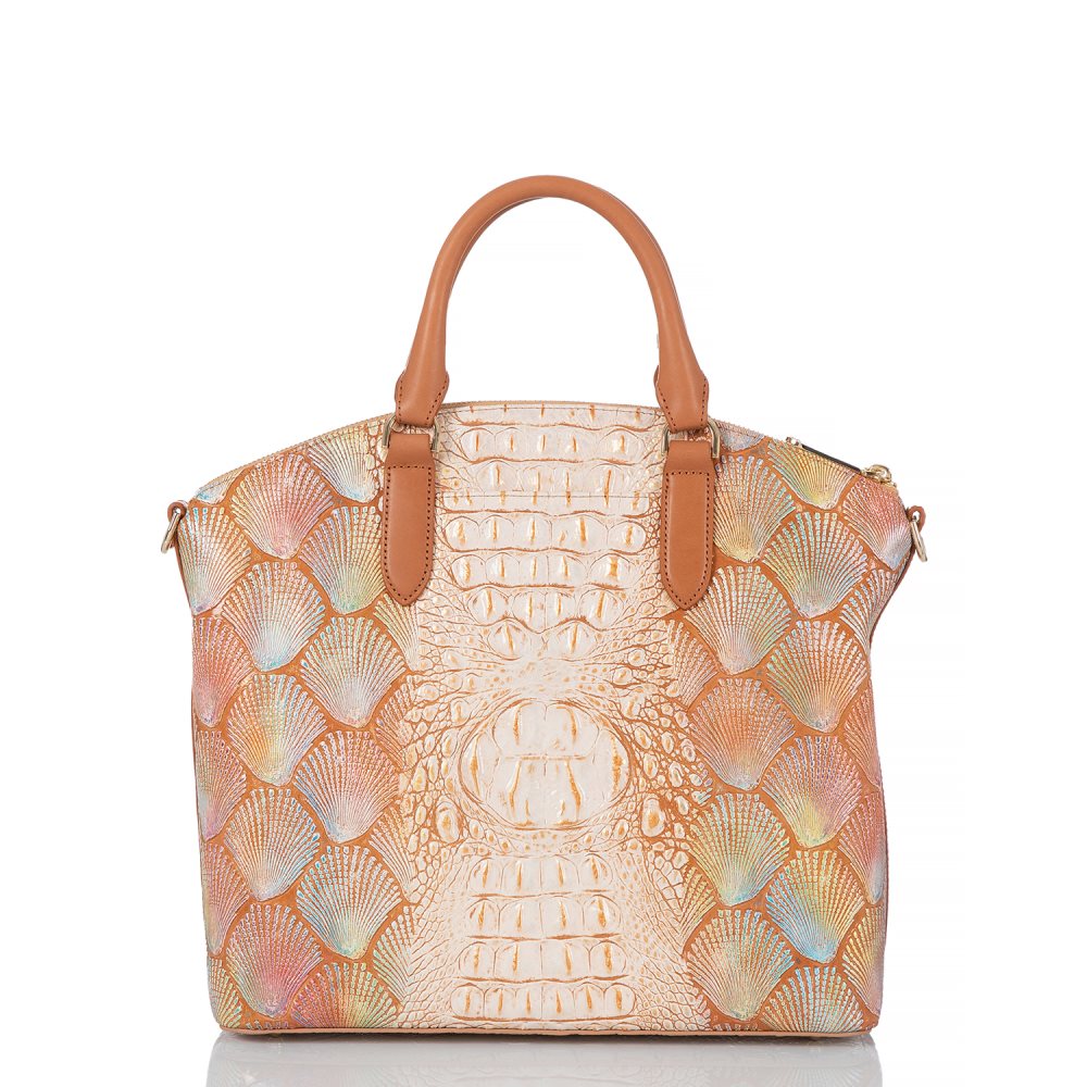 Featured in Scallop Bondi, a gorgeous shell-embossed leather featuring a hand-painted blend of pastel hues trimmed with smooth tan leather. Genuine leather.