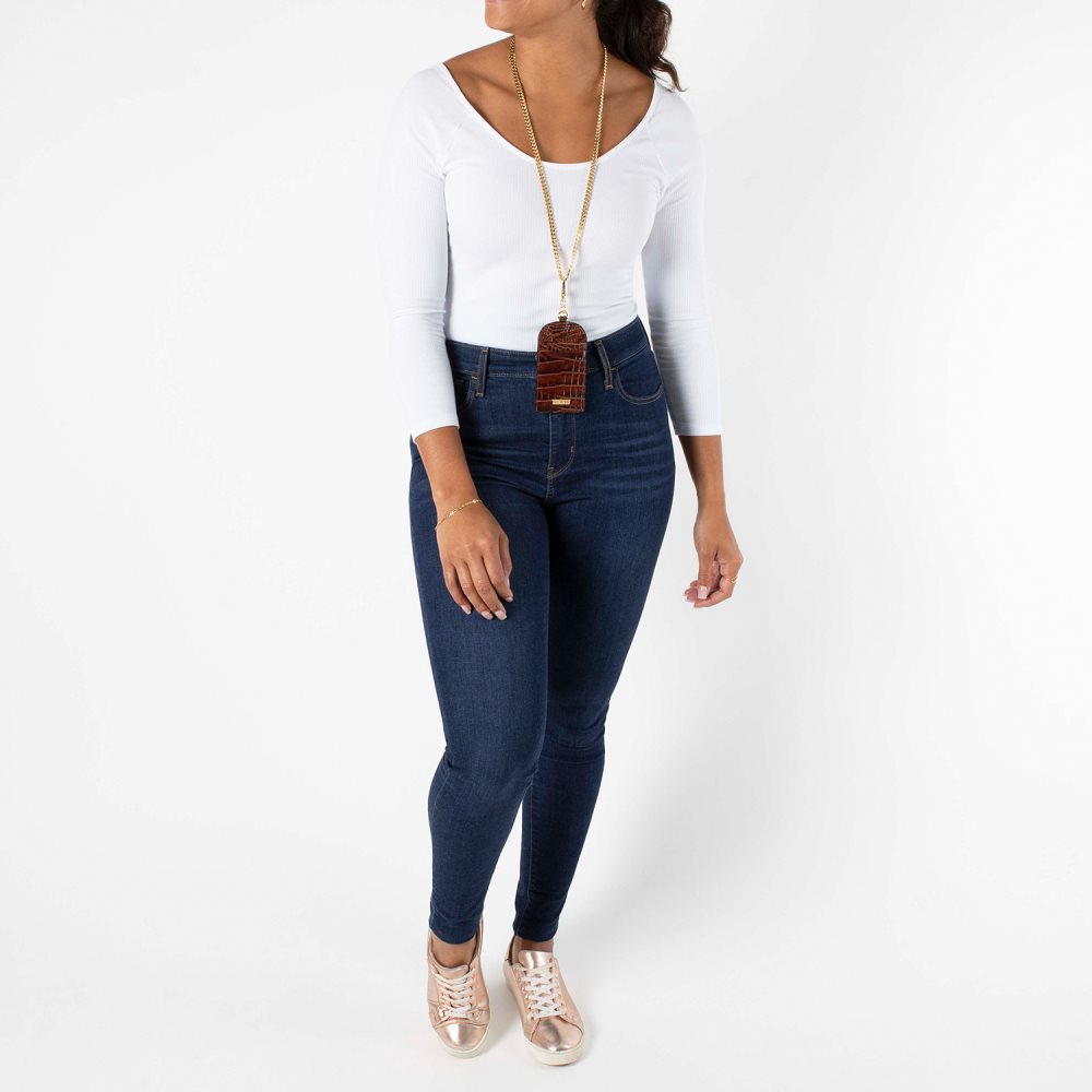 The Stevie is a chic card holder with a stylish lanyard chain strap and curvy silhouette. With two credit card slots, an ID window, and key clip attachment, she's perfect for the office and quick errands.