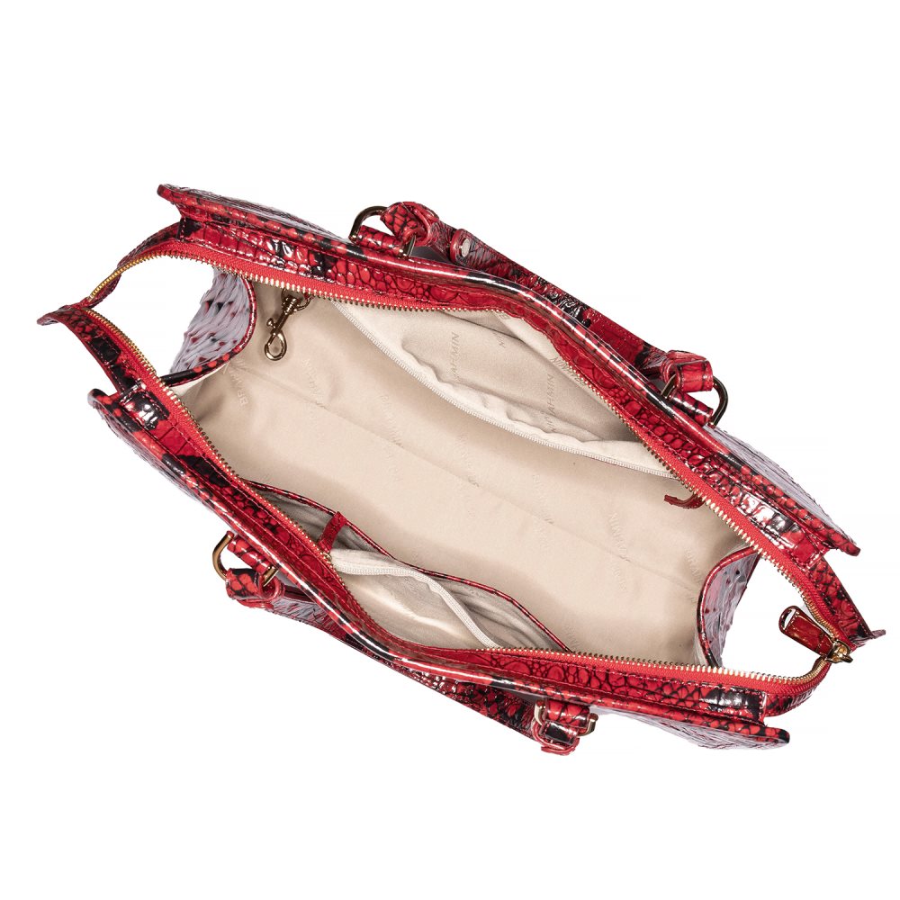 Featured in Lipstick Ombre Melbourne, a striking snake print with fiery red hues and pops of black. Genuine croc-embossed leather.